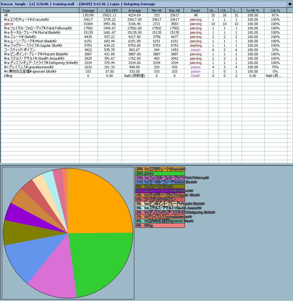 GHのdummy人形のが硬くて良さそうだけど、これまでとの比較にならないかな、と。普段使いの毒と一時バフ全部(含むクローク)で。一時アドーンとエリクサーは無し。Meleeを上手く挟みながらコンシールメントチェイン>デスブローで締めるのが定番です。